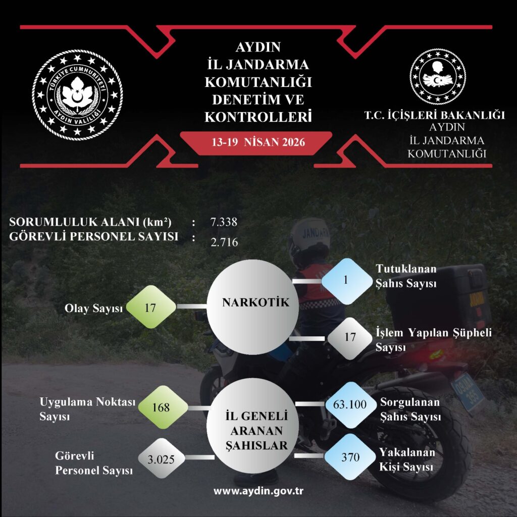 Aydın İl Emniyet Müdürlüğü ve İl Jandarma Komutanlığı ekipleri, 13-19 Nisan 2026 tarihleri arasında il genelinde yürüttükleri kapsamlı denetim ve kontrollerin bilançosunu kamuoyuyla paylaştı. Şehrin huzur ve güvenliği için aralıksız sürdürülen çalışmalarda asayişten narkotiğe, kaçakçılıktan aranan şahıslara kadar geniş bir yelpazede önemli sonuçlar elde edildi.